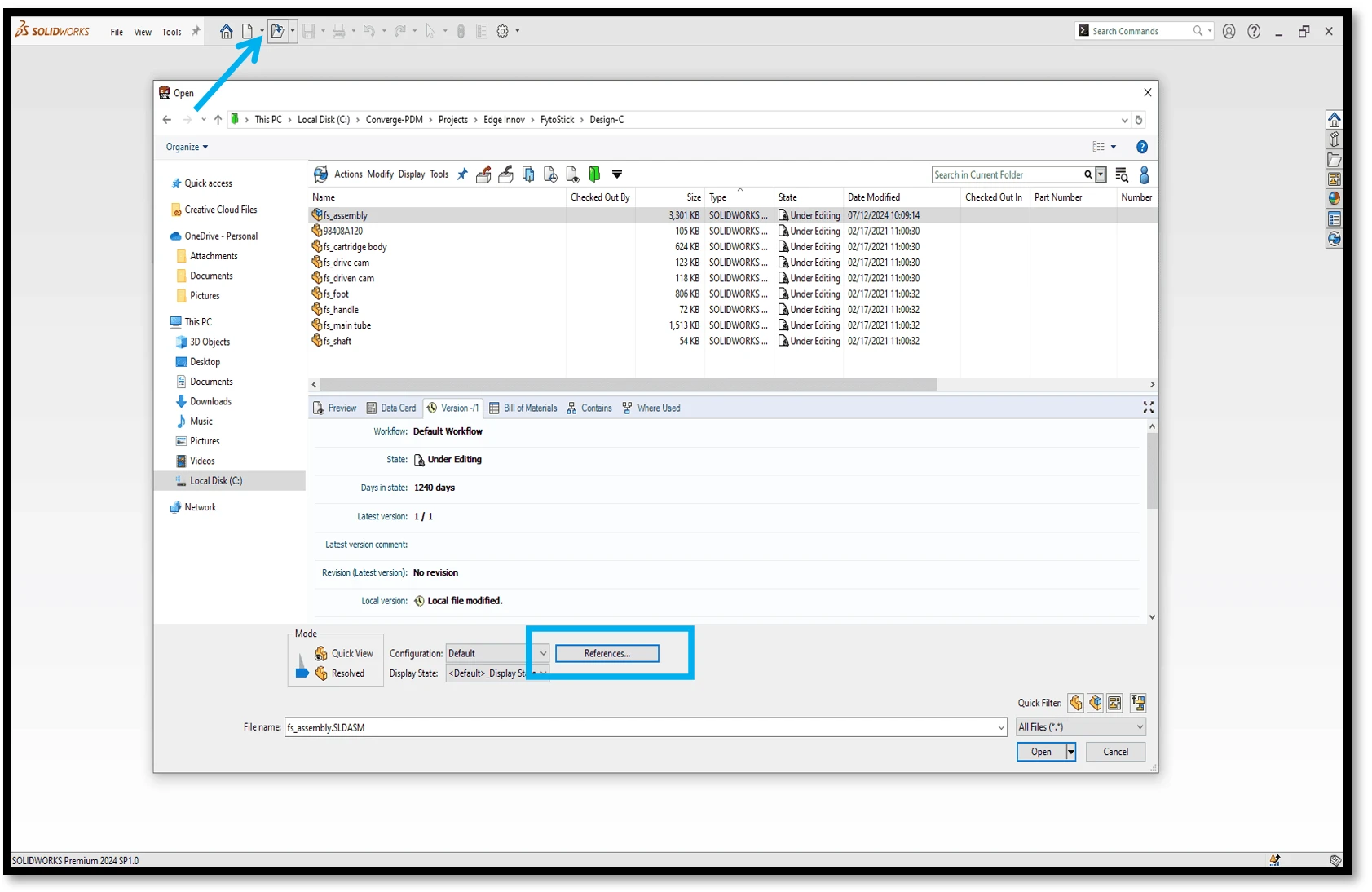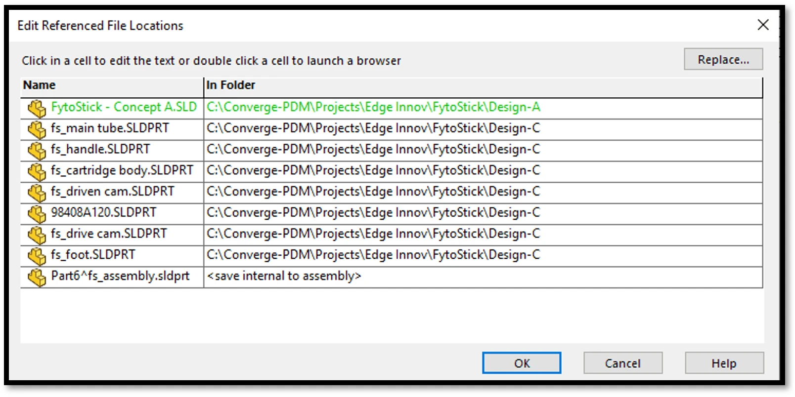 Select the "References..." Button to see all references in an assembly. You can double-left-click on a file or location and browse to the correct file for the assembly to reference. When you make a change, the file will then light up Green within the reference list to let you know the reference has successfully been found and changed.