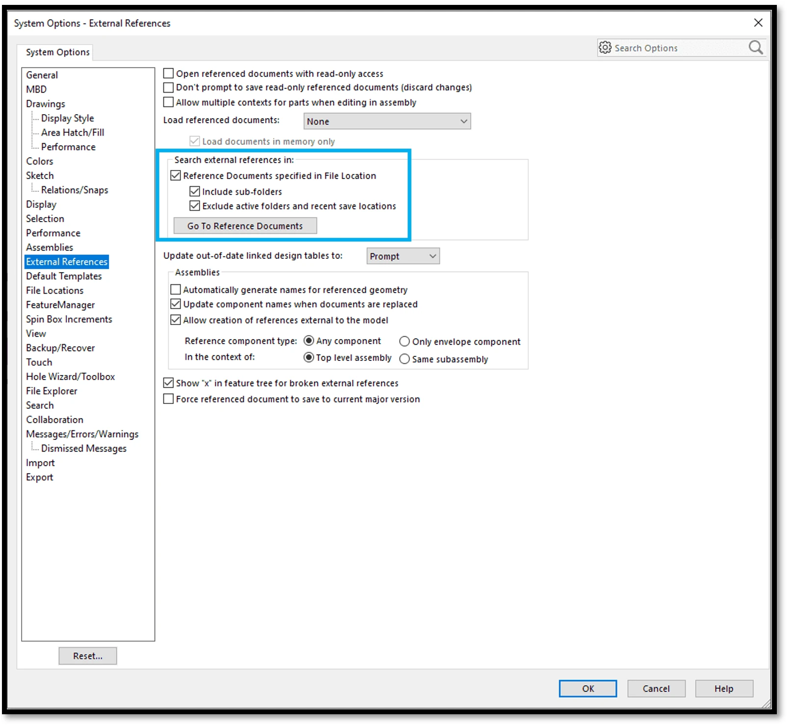 When migrating files and utilizing a PDM Vault through SOLIDWORKS, one way to help SOLIDWORKS CAD locate the files will be through the external reference option. To ensure this is set up correctly, go to SWX CAD > Tools > Options > External References > Check boxes for "Reference Documents specified in File Location" and "Include Sub-Folders" in the search external references section.