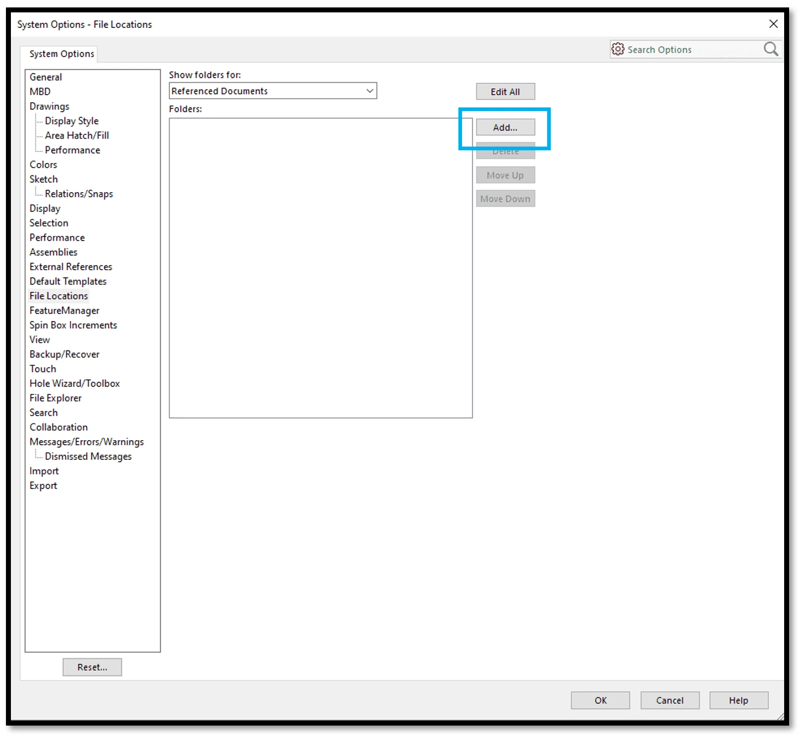 To set the location where SOLIDWORKS will look for reference files, you will select the "Go To Reference Documents" button, select "add," and browse to the root vault folder (C: YOUR_VAULT_NAME_PDM).