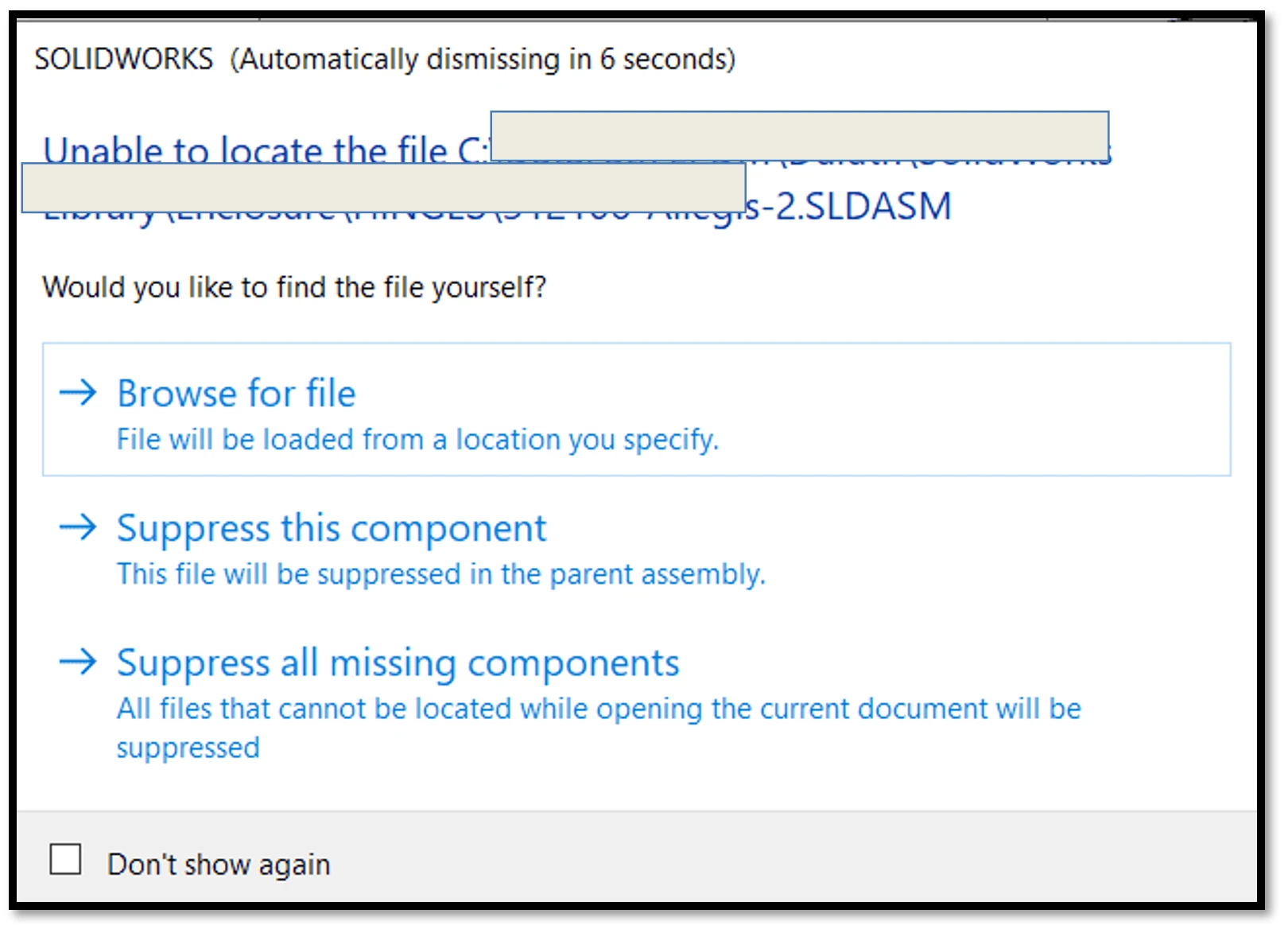 Another option when opening a missing reference file, you may receive an error message asking to locate that missing file or suppress it.