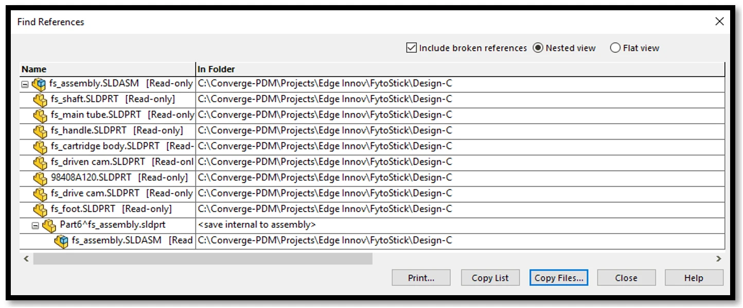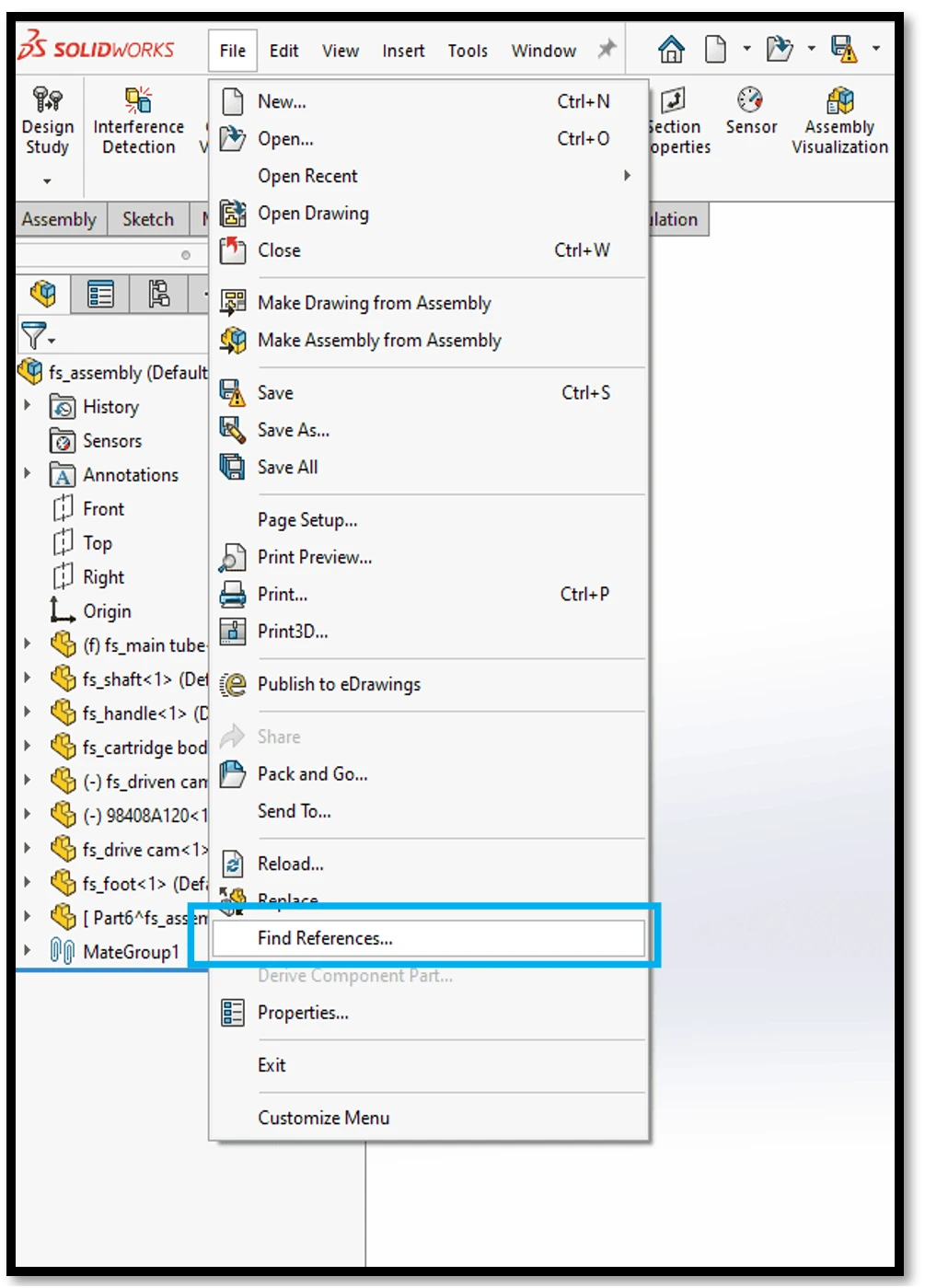 You can also locate and view the file references within an assembly through File > Find References. This provides a rolled-up list of each file within the assembly and its location.