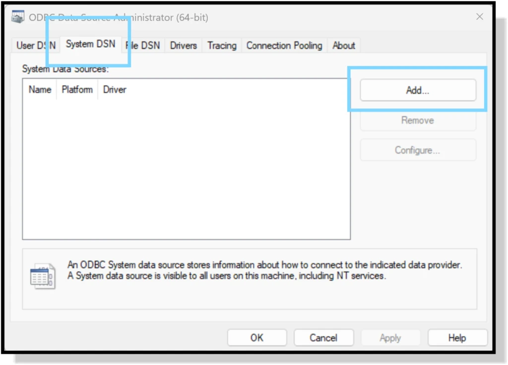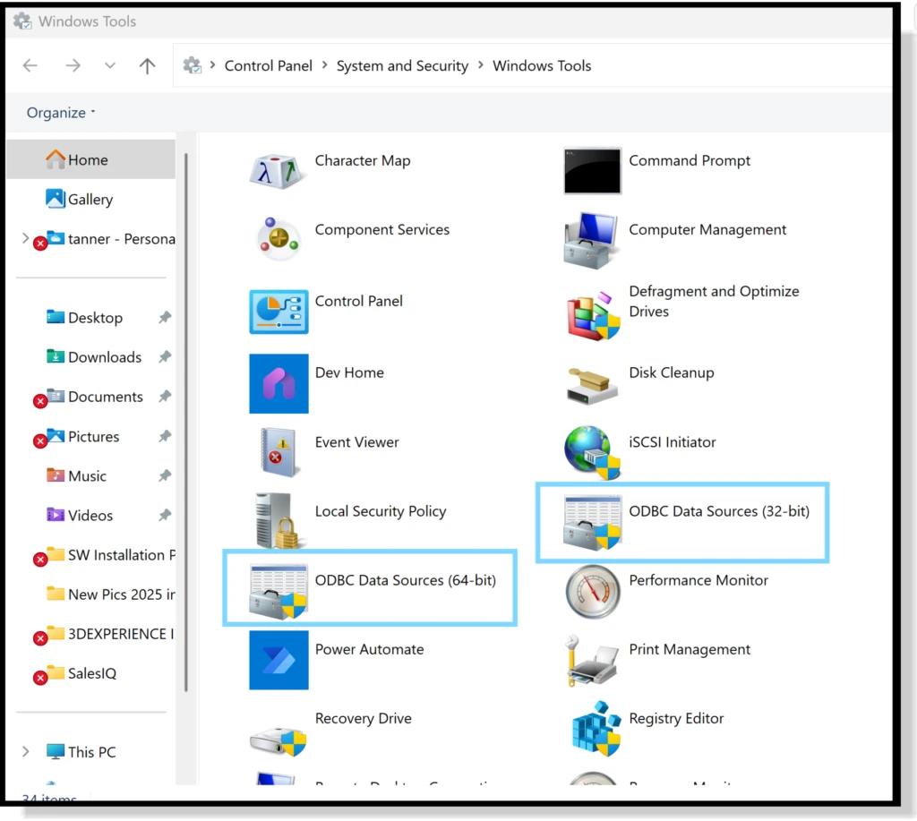 To manually create an ODBC connection, we will use the Windows Administrative Tools (Windows Tools in Windows 11). We will need to access both 32-bit and 64-bit Data Sources.