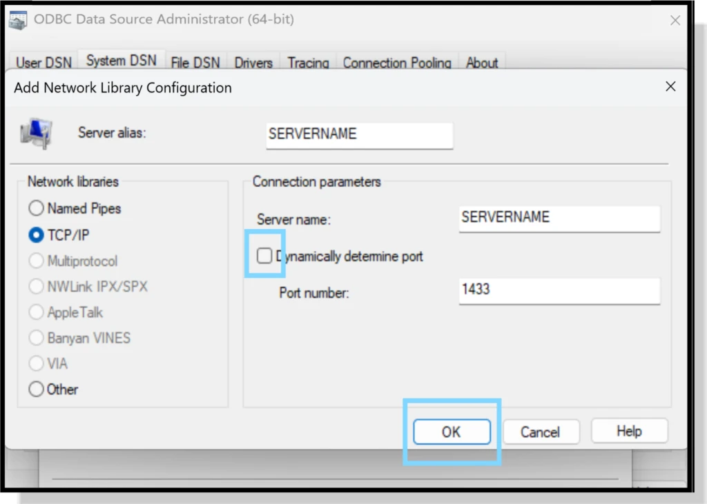 Deselect Dynamically determine port (the default port for Database traffic is 1433) and click OK.