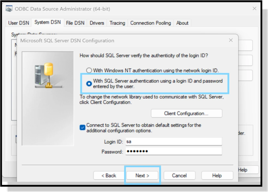 Select With SQL Server authentication using a login ID and password entered by the user and enter the SQL login ID and password (default login is SA).