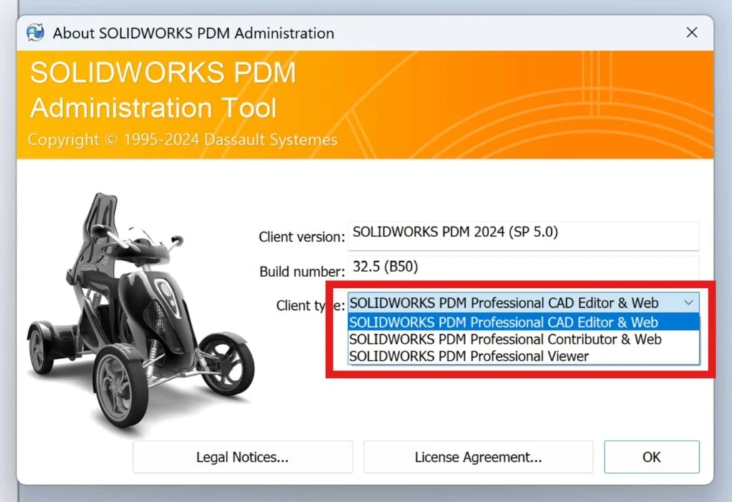 - In the Admin tool, go to Help > About SOLIDWORKS PDM Administration.