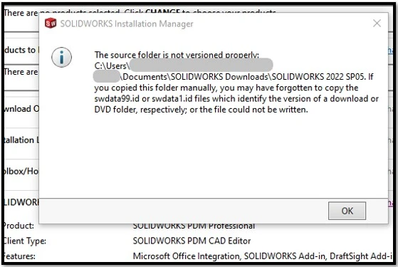 - Sometimes when attempting to modify an existing SOLIDWORKS installation, the installation manager will pop up with the error, the source folder is not versioned properly.