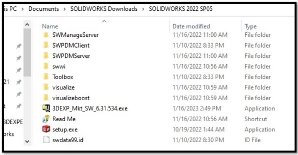 Example: in this example screenshot, we are viewing the SOLIDWORKS 2022 SP05 folder.
