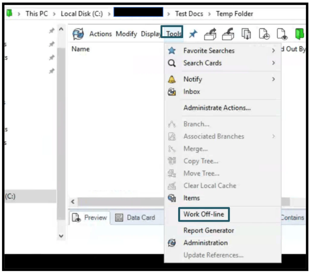 At the top of the vault local view, go to Tools and click on “Work Off-line”.